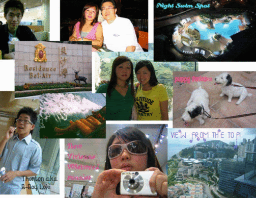 and finally, the jewel in the crown, the piece de resistance, the-- you get the picture. i wish blogger would let me upload bigger images, but i'm too lazy to deal with that right now. so many things to do! anyway, a documentation of my life in hongkong these past two weeks. from left, my bro theo with his mocha frapp; mom and dad at cafe deco @ the peak; the 'night swim spot' aka the outdoor swimming pool i can see from my bedroom window, 30 floors up; twin doggies; the view from the top of the rest of cyberport; my latest extravagance - vivienne westwood sunnies; my new improved bro BBOY LOKI chewing gum; the golden reindeer thingy guarding the hallowed gates of bel-air, and my mom and me.